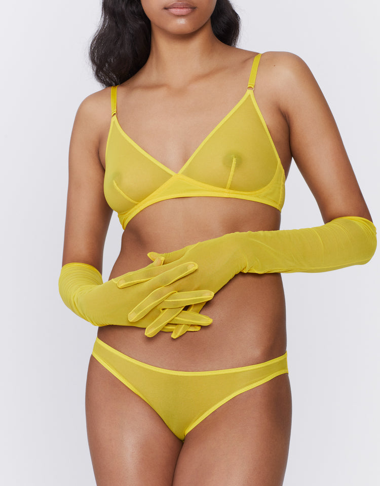 Eldivenimiz iç çamaşırlarımızla uyum sağlayabilmesi için aynı kumaştan; yumuşak, şeffaf ve nefes alabilen streç tülden yapılmıştır. Streç tülden yapıldığı için her bedene rahat şekilde uyar.